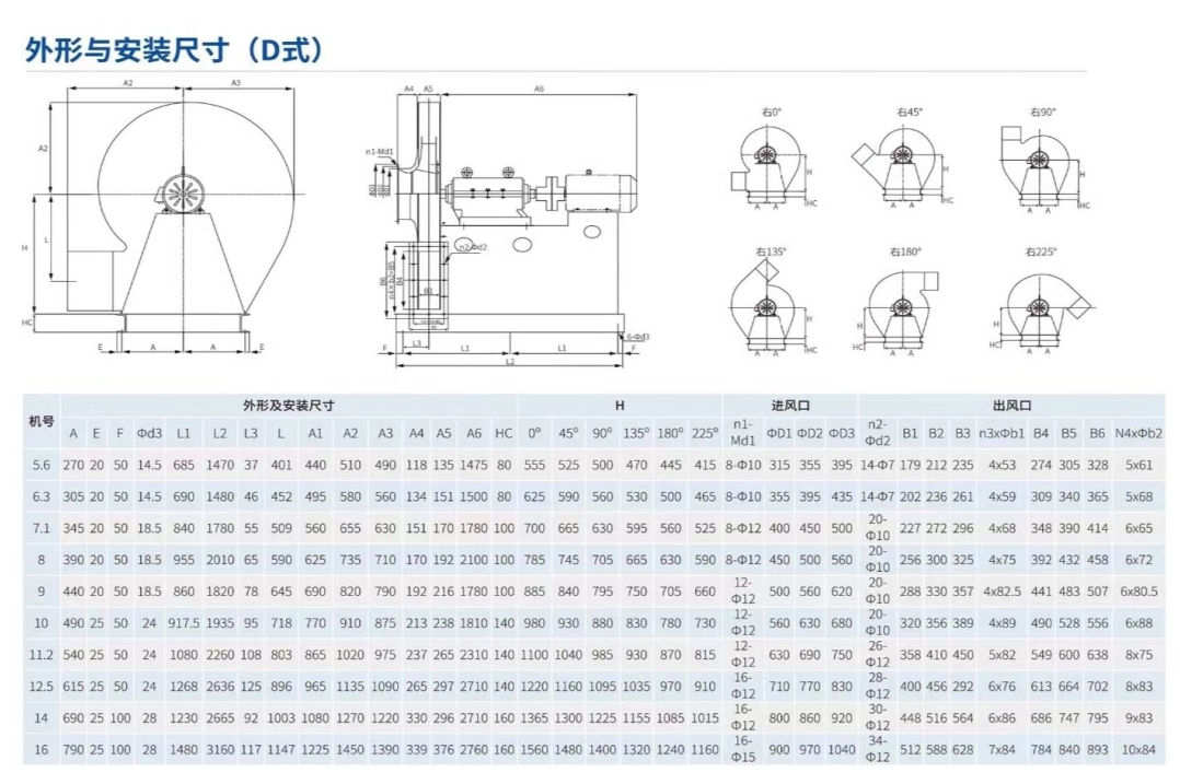 風機的出口位置以機殼的出口角度表示。“左”、“右”均可制成0°,45°,90°,135,180°,225°共六種角度。